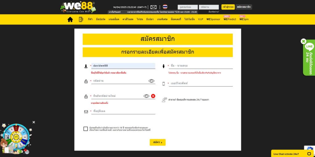 เริ่มจากการลงทะเบียนที่ WE88 หากยังไม่ได้เป็นสมาชิก หลังจากนั้นเข้าสู่ระบบด้วยบัฐชีของคุณเพื่อเข้าใช้เดิมพันคาสิโนสด