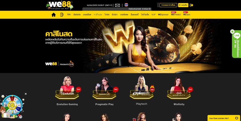 WE88 มีหลายค่ายเกมคาสิโนสดให้เลือก เช่น Evolution Gaming, Sexy Baccarat, ON Casino, winfinity และอื่น ๆ มากถึง 13 ค่ายคาสิโนสด แต่ละค่ายมีรูปแบบโต๊ะและดีลเลอร์แตกต่างกัน เลือกตามสไตล์ที่ชอบได้เลย