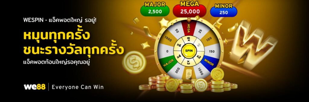 WESpin คือฟีเจอร์พิเศษของเว็บไซต์ WE88 ที่ให้ผู้เล่นได้สนุกกับการหมุนวงล้อเพื่อลุ้นรางวัลแบบสุ่ม ทั้งโบนัสเงินสด ฟรีสปิน และแจ็คพอตรายวัน รางวัลที่มอบให้ผู้เล่นถูกแบ่งตามระดับความยากง่าย ตั้งแต่ Minor, Major ไปจนถึง Mega ซึ่งเริ่มต้นแจกตั้งแต่ 250 บาท ไปจนถึงหลายหมื่นบาท